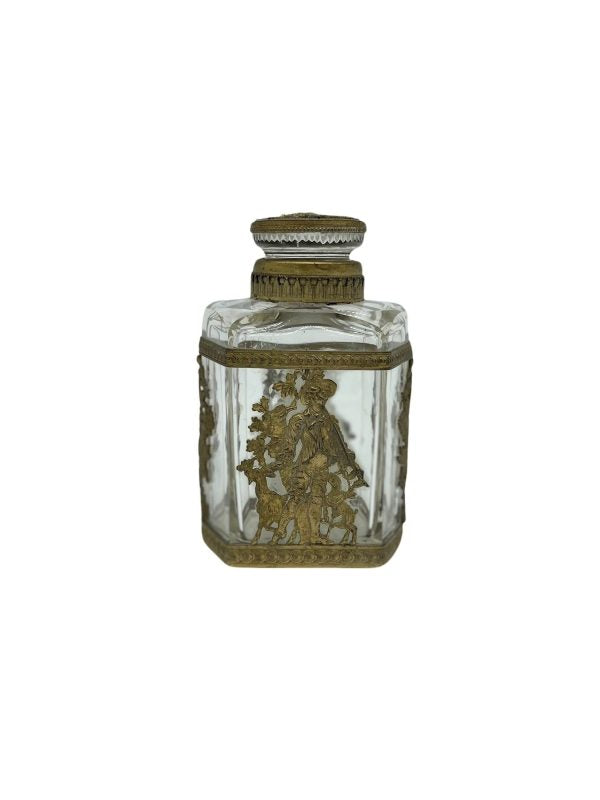Elegant crystal flask with bronze mount and chiseled decoration representing a shepherd