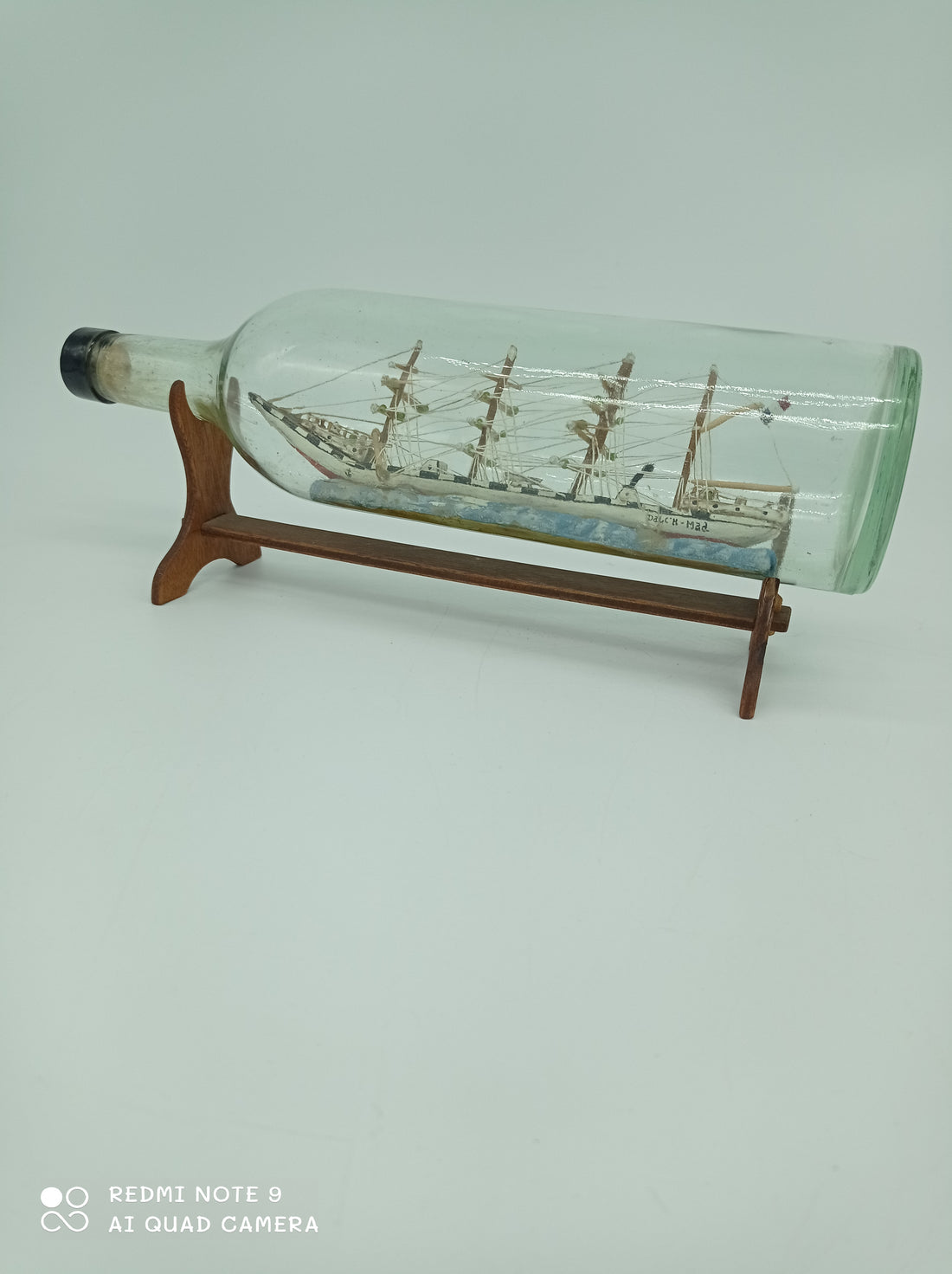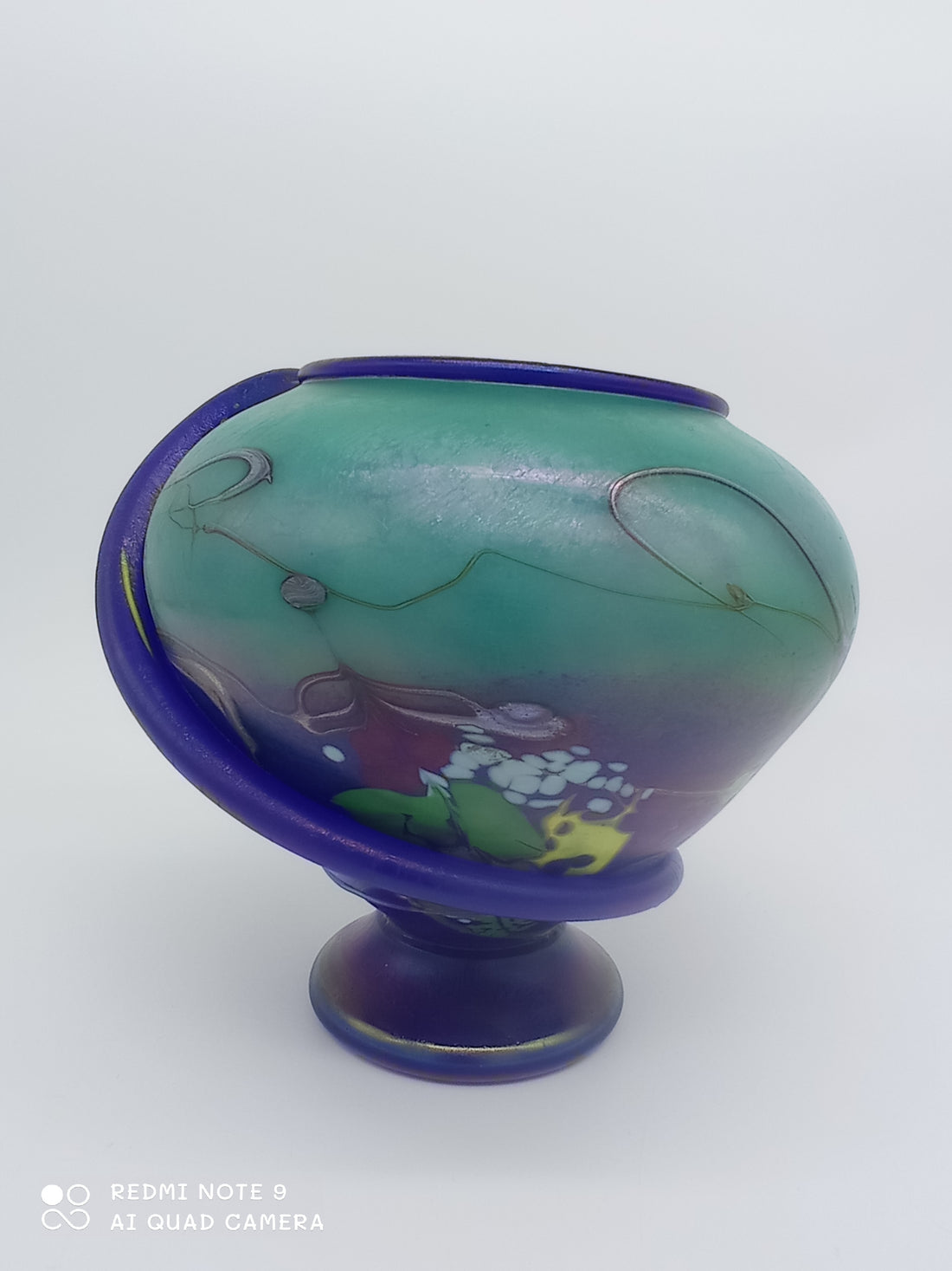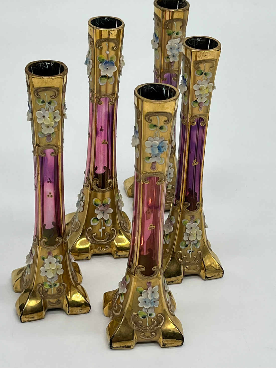 Vase with low body and long neck in red glass with enameled thistle decoration