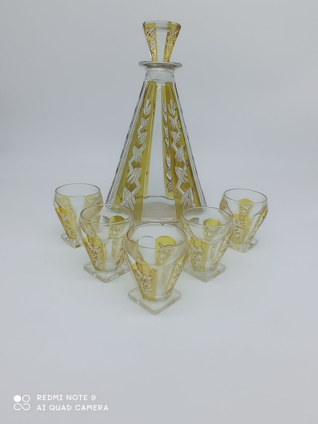 Carafe service and 5 glasses in amber Bohemian Crystal