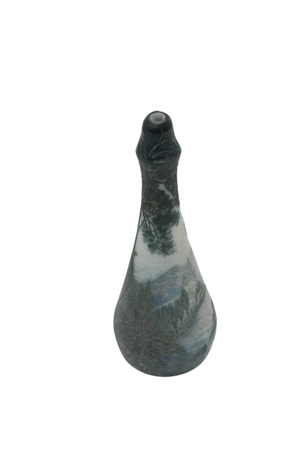 Collectible Pear-shaped vase with a high, flared neck in multilayered glass with an acid-etched decor depicting a village scene. Signed on the body.