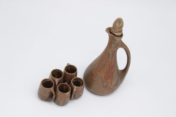 Unique Brown stoneware liqueur set with drip decor, comprising of a carafe and five glasses with handles on a circular tray.DENBAC
