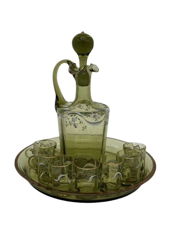 Liqueur service in green glass with enamelled decoration of flowers