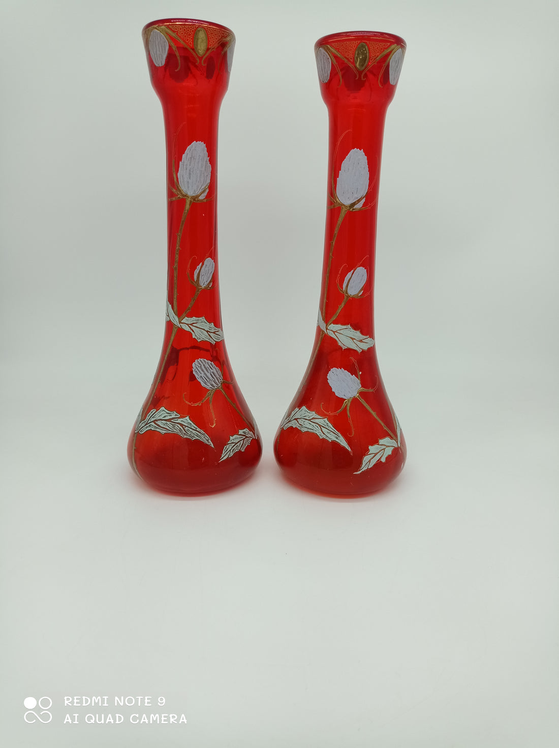 Vase with low body and long neck in red glass with enameled thistle decoration